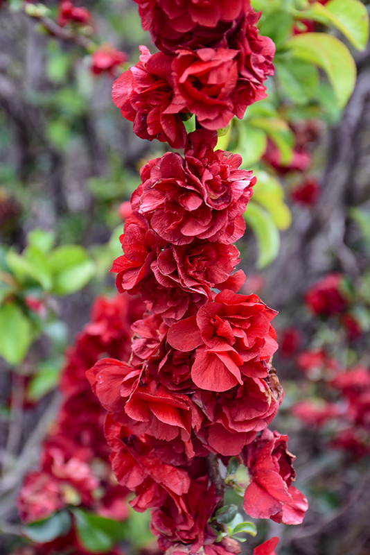 Double Take® Scarlet Flowering Quince features showy double scarlet cup-shaped flowers with buttery yellow eyes along the branches in early spring before the leaves. The flowers are excellent for cutting. It has green deciduous foliage which emerges red in spring. The glossy oval leaves do not develop any appreciable fall color.