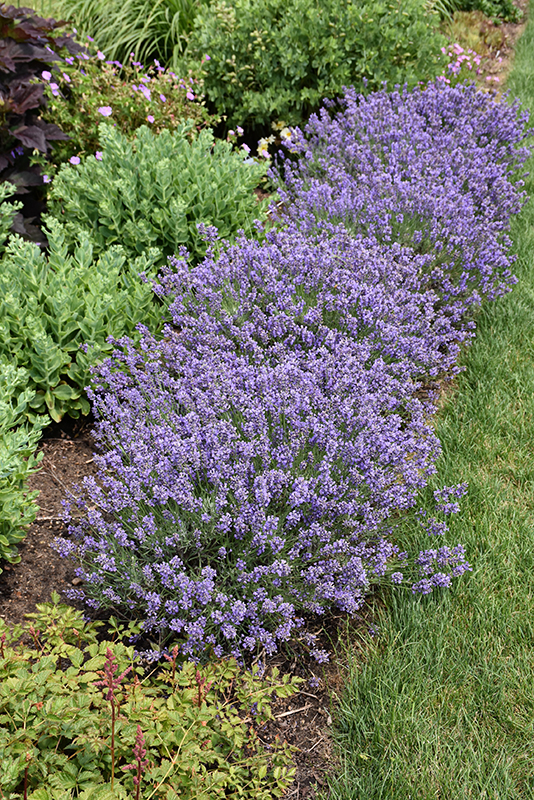 Essence Purple Lavender will grow to be about 12 inches tall at maturity extending to 18 inches tall with the flowers, with a spread of 24 inches. It tends to fill out right to the ground and therefore doesn't necessarily require facer plants in front. It grows at a slow rate, and under ideal conditions can be expected to live for approximately 10 years.