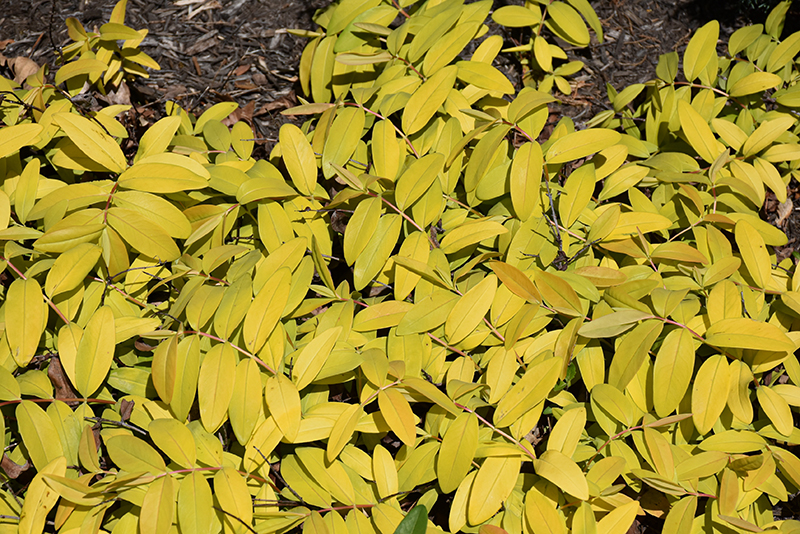 Brigadoon St. John's Wort has attractive orange-variegated yellow foliage which emerges chartreuse in spring on a plant with an upright spreading habit of growth. The oval leaves are highly ornamental but do not develop any appreciable fall color. It has masses of beautiful yellow buttercup flowers at the ends of the branches from early summer to mid fall, which are most effective when planted in groupings. The flowers are excellent for cutting.