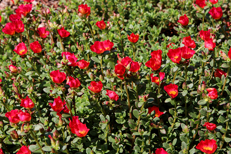 Mojave® Red Portulaca features showy red cup-shaped flowers with gold eyes at the ends of the stems from late spring to early fall. Its small succulent oval leaves remain green in color throughout the season.