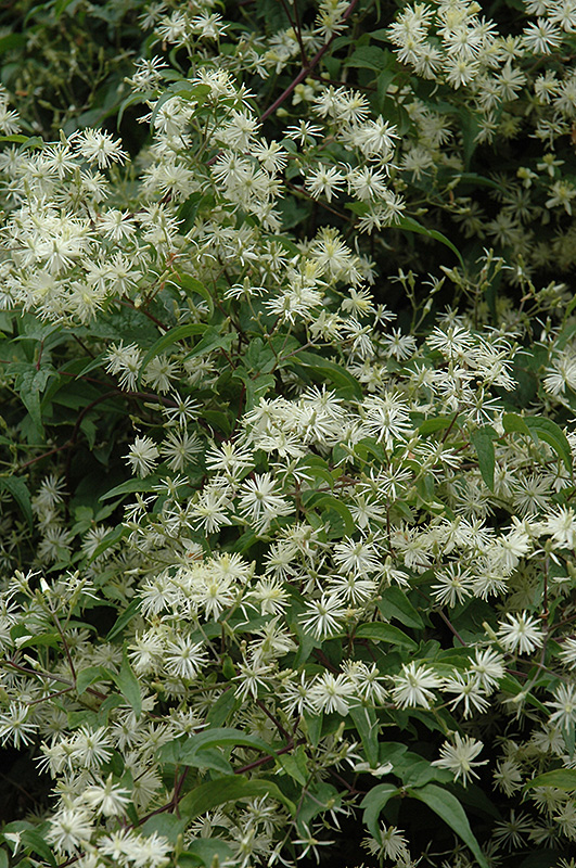 Dainty, star-like creamy white flowers are sweetly scented and completely cover this vigorous vine late in the season, makes a fabulous screen; keep the roots cool for best results; can grow up to 20 feet; attractive silver seed heads